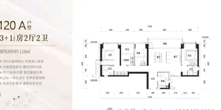 118㎡的4房2厅2卫,A户型(1栋1/2单元01户型),设计的是横厅格局,进门入户玄关,客餐厅6米开间,LDKB一体化设计,4个卧室分别做到了主卧17.65㎡/次卧11.02㎡/次卧9.12㎡/次卧8.74㎡(包含墙体飘窗),客餐厅出6米长的观景大阳台看深大校区,U型厨房,公卫三段式分离,得房率约90%(包含赠送),西北朝向。