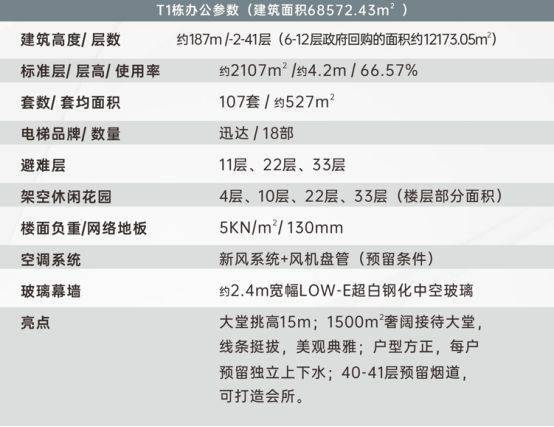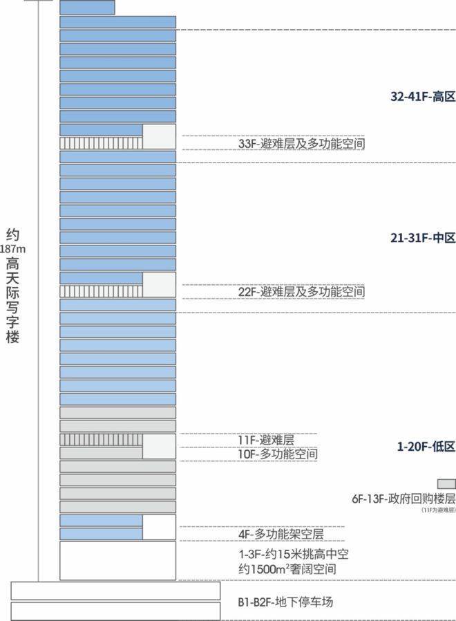 高、中、低区共配置18台高速电梯,出售楼层位于14-41层(6-13层为政府回购楼层),标准层面积约2099㎡,主力面积段为建面约486-562㎡,4.2米层高。