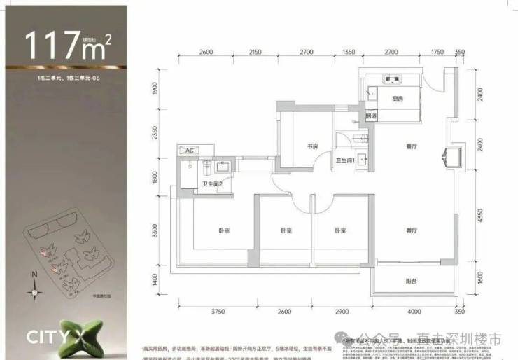 117㎡的4房2厅2卫,1栋2/3单元06户型,设计的是经典竖厅格局,进门入户玄关,客厅4米开间,LDKB一体化,S墙设计预留冰箱卡槽位,四开间朝南,动静分区,4个卧室分别做到了主卧16.5㎡/次卧9.57㎡/次卧8.58㎡/次卧7.97㎡(包含墙体飘窗),U型厨房,公卫三段式分离,得房率约75.4%(不含赠送),东南或西南朝向。套内面积88.24㎡+赠送面积13.43㎡=实得101.67㎡,加上赠送后得房率约86.87%。