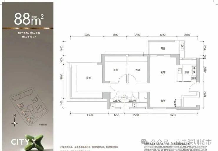 88㎡的3房2厅2卫,设计的是竖厅南北通透格局,客厅3.3米开间,LDKB一体化设计,四开间朝南,主卧270°无转角飘窗,3个卧室分别做到了主卧15.63㎡/次卧7.54㎡/次卧6.96㎡(包含墙体飘窗),U型厨房,卫生间干湿分离,得房率约74.6-75.4%(不含赠送),阳台主朝西北或东北向。套内面积66.45㎡+赠送面积11.58㎡=实得78.03㎡,加上赠送后得房率约87.56%。