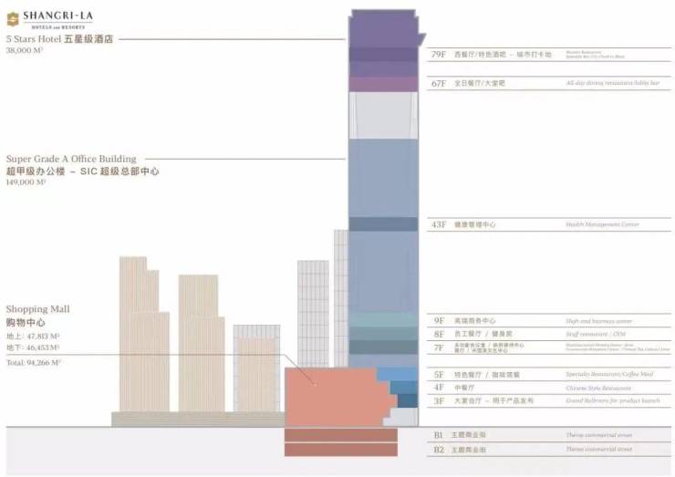 项目共80层,分别布局约8.9万㎡高端商业Mall超深活中心(B2-4F)、约9万㎡超甲级写字楼(5-43F)、约6万㎡ SIC65 办公商务会馆(44-64F)、约3.8万㎡香格里拉酒店(65-78F)四大场域,共同构筑人类在密度建设区域内的垂直空间想象。