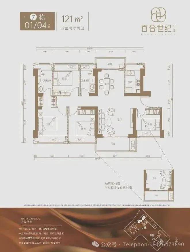 7栋121㎡的4房2厅2卫,设计的是竖厅南北通透格局,双阳台设计,客厅4.15米开间,4个卧室宽度分别为3.4/2.9/2.8/2.75米,U型厨房,全屋飘窗设计。