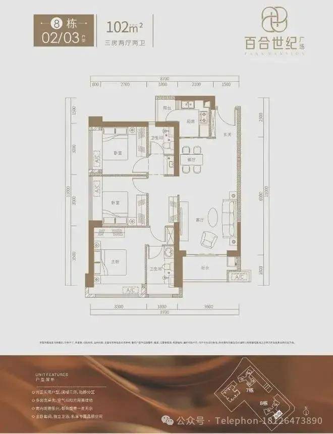 8栋102㎡的3房2厅2卫,设计的是竖厅格局,餐客厅一体化,客厅3.6米开间,3个卧室宽度分别为3.3/3/3米,阳台1.6米进深,L型厨房,有带1个小生活阳台,都是东南朝向。