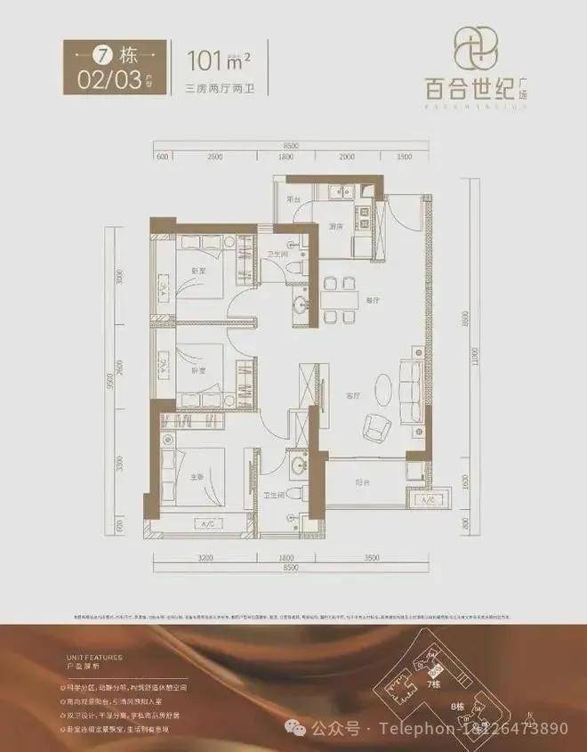 7栋101㎡的3房2厅2卫,设计的是竖厅格局,餐客厅一体化,客厅3.5米开间,3个卧室宽度分别为3.2/3/2.6米,阳台1.6米进深,L型厨房,有带1个小生活阳台,都是东南朝向。
