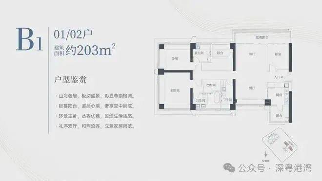 匠筑建面约124-203㎡全生命周期天幕户型,360°采光通风,270°环景主卧,山海日常推窗可得。背山面海,藏风聚气,家宅福泽之地。