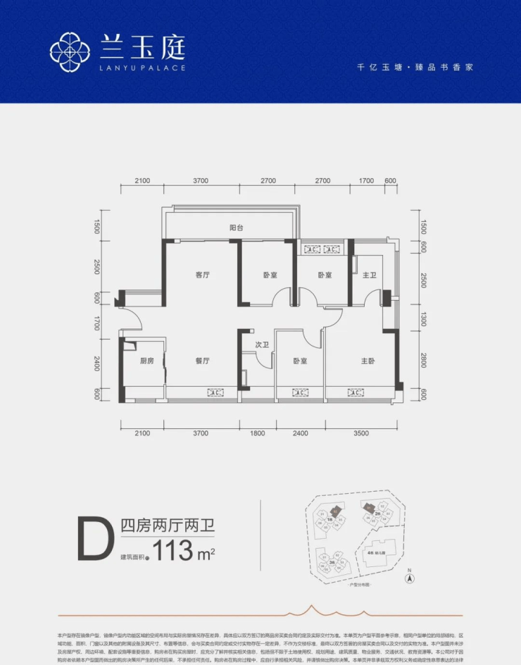 113㎡的4房2厅2卫,D户型,设计的是竖厅南北通透格局,客厅开间3.7米,4个卧室分别做到了3.5米/2.7米/2.7米/2.4米的宽度,客厅连接次卧出6.4米长的大阳台,U型厨房,公卫三段式分离,得房率约79%(不含赠送),阳台主朝西北或东北向。