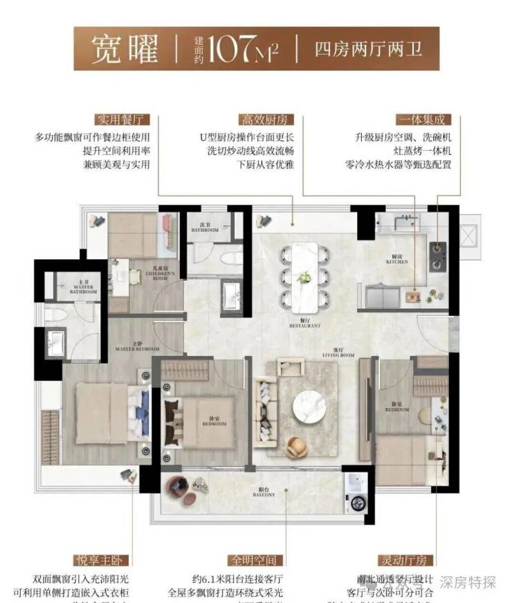 这里西南107㎡朝向由于是南北通透,北面还能看到壹方天地的商业城市景观。