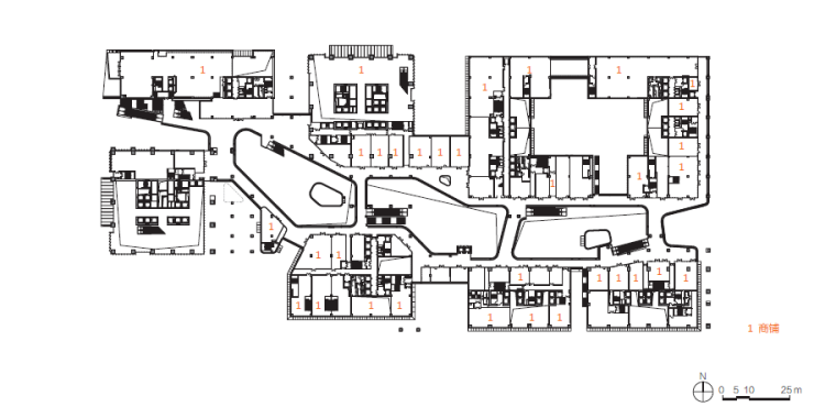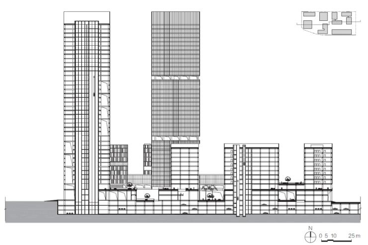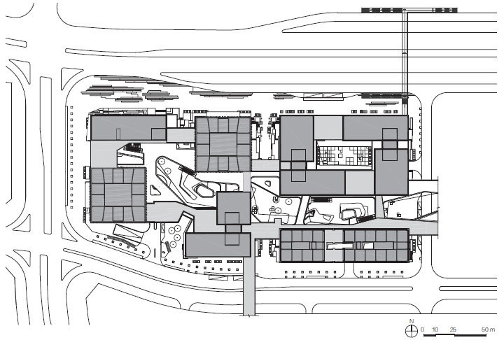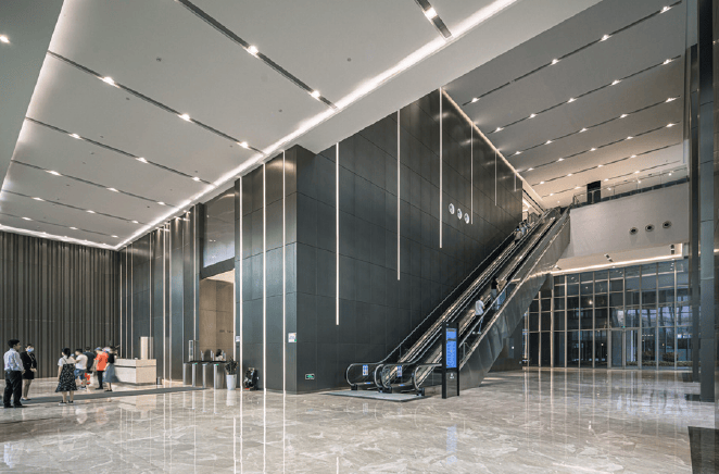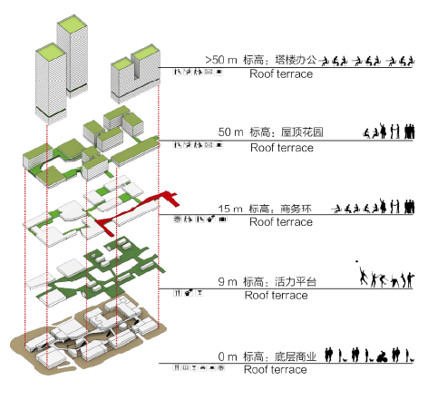总体建筑布局顺应城市设计,呼应中心广场与视线通廊,来自城市各个方向的人行动线将底层划分为开放的城市活力街区。通过街巷空间的模拟、提炼,结合实际功能需求及空间感受,重塑了底层活力街区的尺度。设计师在主要的街区流线交叉点,植入不同特色功能的庭院空间,有效地激活片区、街区。在上述底层街区的基础上,设计师还将其与复合多元化的公共活动庭院通过楼梯、扶梯、电梯、坡道等垂直交通方式进行有机联系,使其成为立体化城市活力街区。这为后期运营中各类公共活动、公共艺术搭建了舞台,营造了丰富的城市生活,紧密连接了城市空间。