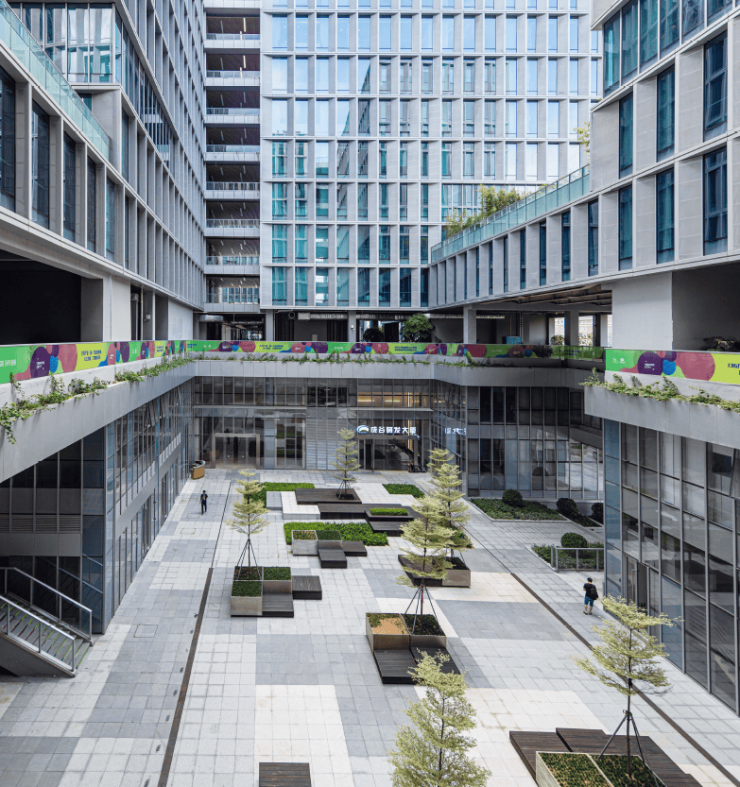 而在园区的高区部分,我们则设置了满足大型企业的总部空间。设计通过极佳的空间品质、景观视线,吸引头部企业入驻,从而带动产业链从上向下依次辐射。这种根据企业的发展阶段及需求,将园区分层处理的方式,既延续了“多层地面”的立体园区理念,又进一步顺延了全生命周期的企业发展需求。整个园区从下到上,公共度递减,私密度递增,使用人群各取所需,从而最大化提升了产品的附加值。