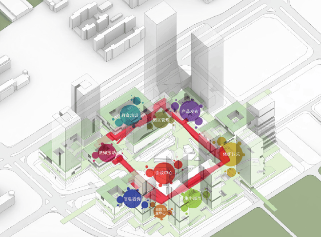同时,“企业活力环”串联起多个公共空间,最终形成环形的公共空间系统,将整个园区连成一体。“企业活力环”通过功能的设置、场所的营造、事件的策划,能够促进企业的发展。“企业活力环”的设计以场景为核心,以体验为驱动力,探讨符合创业团队所需的功能,如健身房、电影院、体验店、商业广场、餐饮服务、空中慢跑道、共享图书馆、托幼中心等,以街区式、体验式场景,促进了科技创新产业人群的交流,并提升了产业空间的活力。