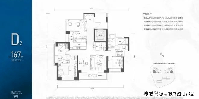 167㎡的5房2厅3卫,1栋02/2栋03高区户型,电梯入户送独立公区,设计的是竖厅双龙抱珠格局,四开间朝南,超宽敞客厅巨幕阳台,主卧大套间设计,U型厨房,双公卫三段式分离,得房率:72.07%(不含赠送),西南朝向。