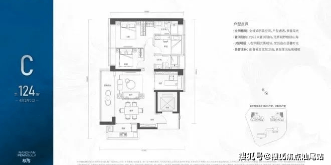 124㎡的4房2厅2卫,1栋01/2栋05户型,电梯入户送独立公区,设计的是横厅南北通透格局,客餐厅6.1米开间,LDKB一体化设计,五开间朝南,主卧大套间设计,6.1米长观景大阳台,U型厨房,公卫三段式分离,得房率:72.07%(不含赠送),西北或东南朝向。