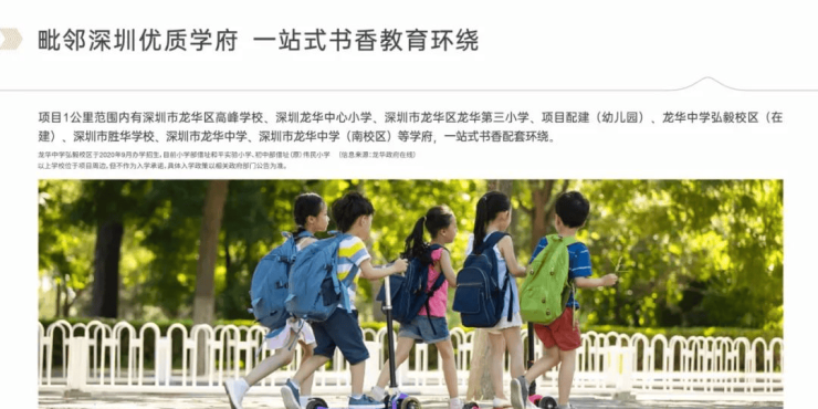 百年高峰学校(龙华区公立四大、十大录取率排名前三)、龙华中学弘毅校区(广东省一级)、龙华中学中心校区(广东省一级)、龙华第三小学(公办32班小学)、项目配建幼儿园等