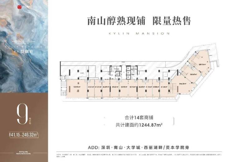 9栋M层为14套商铺,共计1244.87 ㎡;其中01-02-03铺为挑高铺; 整体为2层铺;
