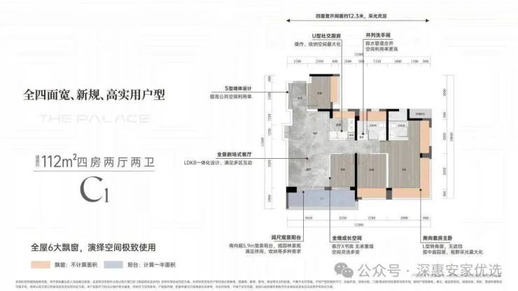 T7(一单元)/T8(二单元)为总高60层的商品住宅,4梯6户,面积为75-127㎡3-4房以及125-127㎡复式;T9(三单元)/T10(四单元)为总高53层的商品住宅,4梯3户,面积为183-270㎡4房以及270㎡复式;T11(五单元)为总高52层的商务公寓,3梯3户,面积为164-289㎡3-4房;T12(六单元)为总高18层的商务公寓,2梯2户,面积为239㎡4房。该项目的公寓均为70年产权,通燃气、带阳台。层高:78-128㎡3.05米,253㎡3.3米,270㎡3.5米。车位比:1499个 ,1:1.3