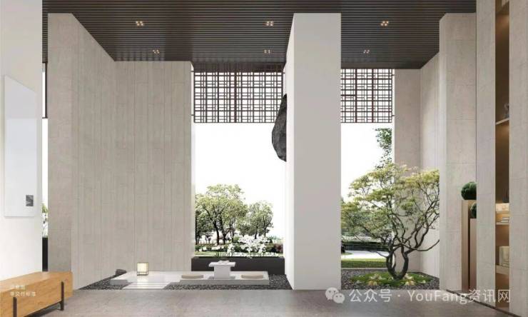 以东方雅韵为出发点,从尺度、比例、制式、材质等细节方面,将新中式建筑精髓与当代格调完美融汇于大门之中;极致挑高尺度,尽显恢弘气度