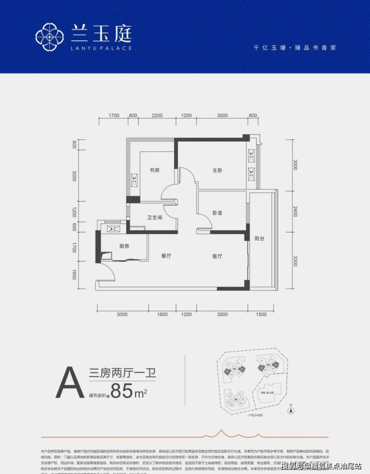 85㎡的3房2厅1卫,A户型,设计的是竖厅格局,客厅开间3.3米,LDKB一体化,三开间朝南,3个卧室分别做到了3米/2.8米/2.4米的宽度,客厅连接次卧出5.7米长的大阳台,L型厨房,得房率约79%(不含赠送),西南或东南朝向。