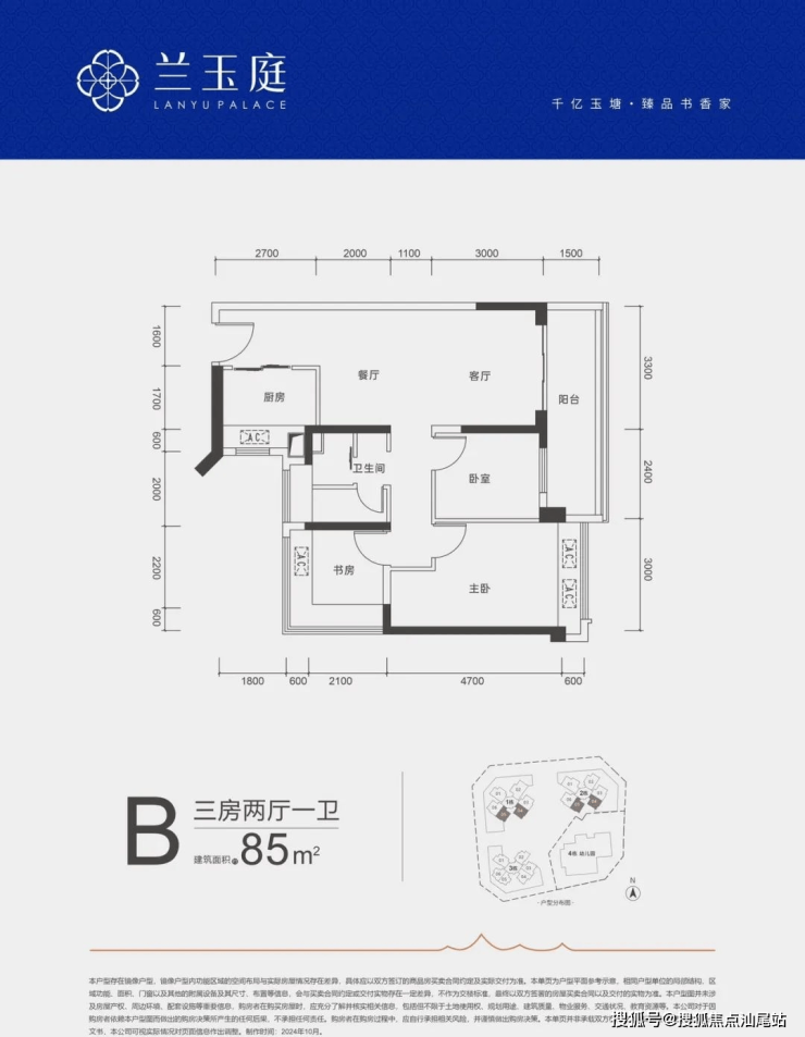 85㎡的3房2厅1卫,B户型,设计的是竖厅格局,客厅开间3.3米,LDKB一体化,三开间朝南,3个卧室分别做到了3米/2.7米/2.4米的宽度,客厅连接次卧出5.7米长的大阳台,L型厨房,创新式三分离卫生间,得房率约79%(不含赠送),西南或东南朝向。