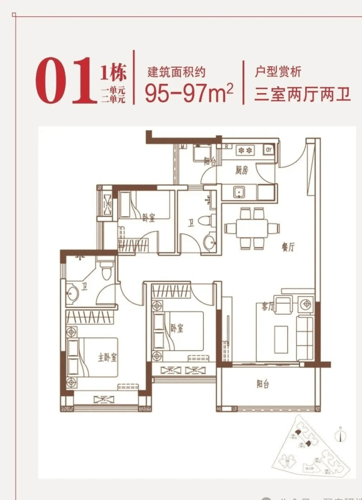 💎约95-97㎡三房:南向端头位,三面采光,花园瞰景。