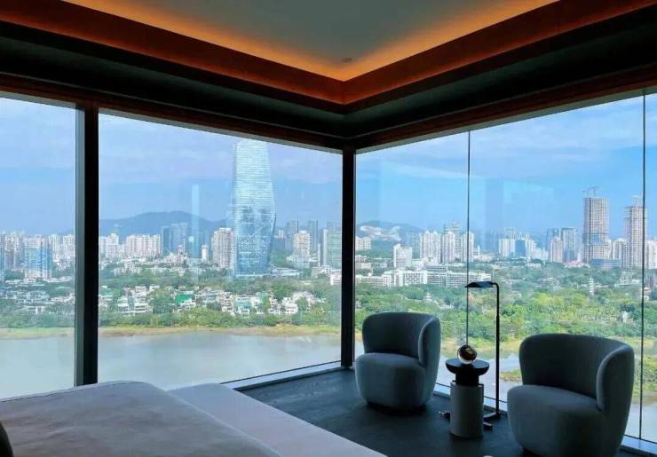 三百平做两房,在深圳应该是独一份的设计了,确实是非常奢享的定位!横厅客餐厅一体,尺度还是比较够,厨房旁边有独立生活阳台,两个套房设计,主卧步入式衣帽间。
