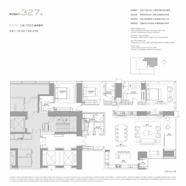 南北通透三面采光,顶奢总统套房规格,270°全景套房,享受湿地/公园/CBD景观,都是套房设计,更具私密性,中西厨分离。