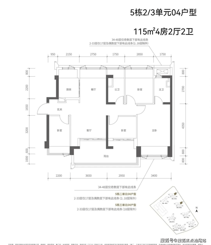 【五栋二单元-平面图】3梯4户,4条腿,01号房户型约144㎡的5房2厅2卫,02、03号房户型约96㎡的3房2厅2卫,04号房户型约115㎡的4房2厅2卫。