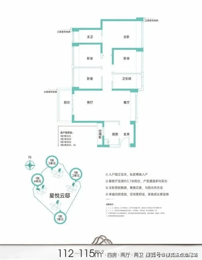 112-115㎡四房两厅两卫:竖厅通透格局,客厅3.7米开间,进门独立入户玄关,全屋飘窗设计。
