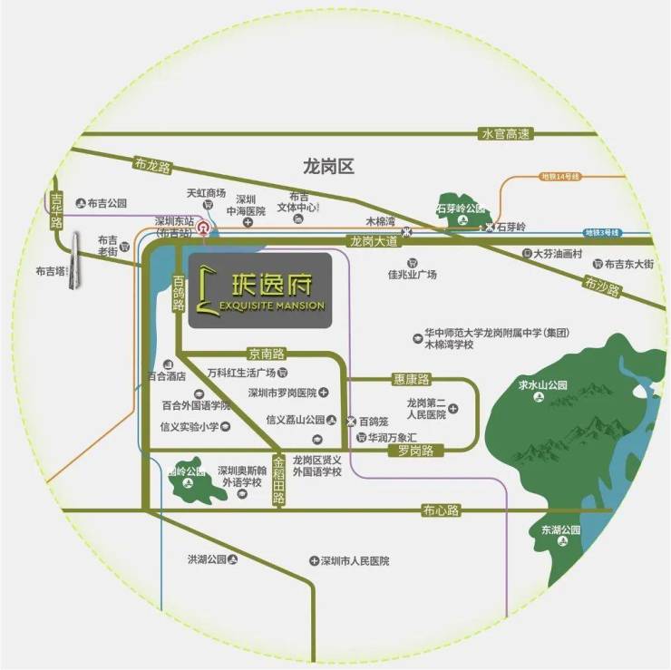 直线距离约625m布吉公园,周边2公里内享求水山公园、布吉公园、石芽岭公园、荔山公园、围岭公园5大公园,坐享天然健身房、游乐场,满足家庭成员愉悦身心的生活需求。