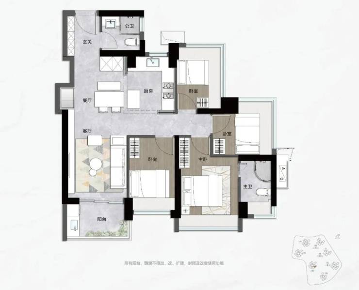 约89㎡三房两卫户型主打舒适,方正实用。
