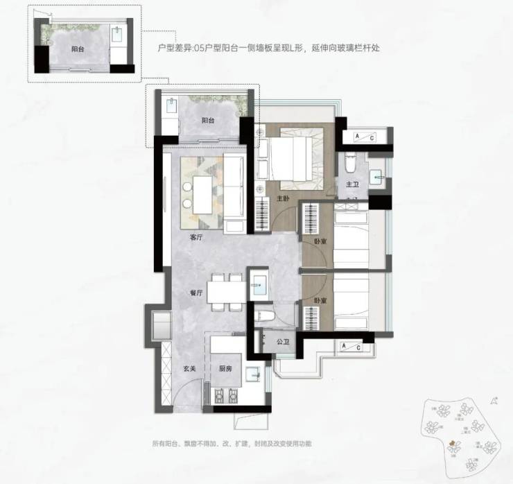 入门级的就是片区内罕有的约83㎡三房两卫,同样拥有主卧套房的私密、双次卧的方正和全屋飘窗,对二胎非常友好。