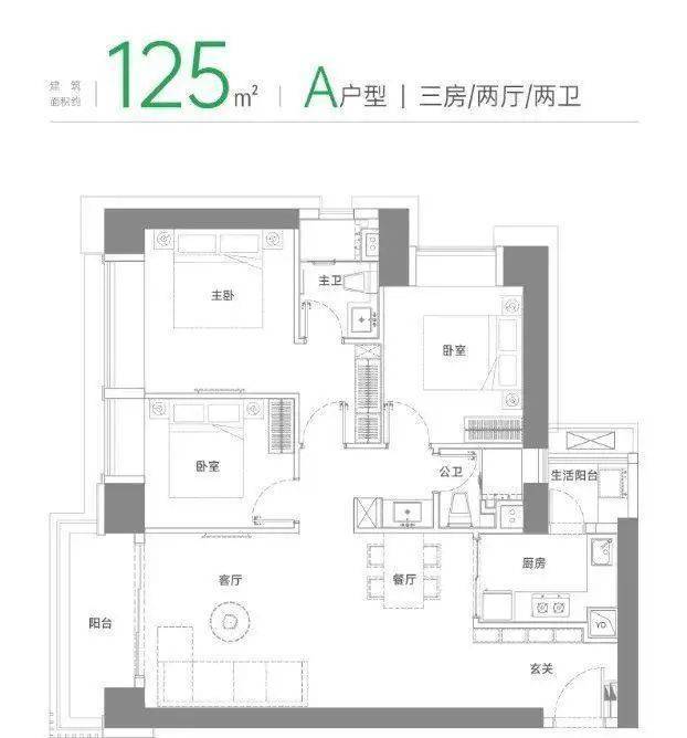 A户型:传统的三房两厅两卫,动静分区户型,厨房带生活阳台。房间做得相对均衡。也是货量最多的户型