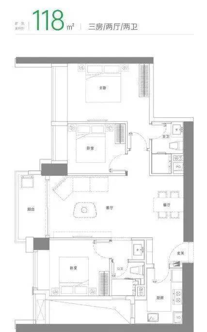 缺点是,两侧单面采光设计,没有侧向采光面,主卧为暗卫,厨房和公卫采光差。
