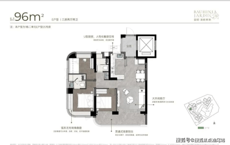 96m²三房两厅两卫的E户型:竖厅格局,拥有超宽客厅,LDKB一体化设计,动静分区。三开间朝南,得房率高达92-100%(含赠送部分)