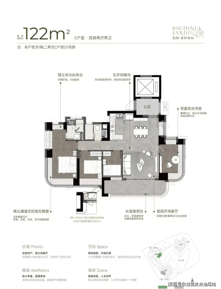 122m²四房两厅两卫的C户型:双龙抱珠户型,得房率约92-100%(含赠送),朝向为西南或东南。