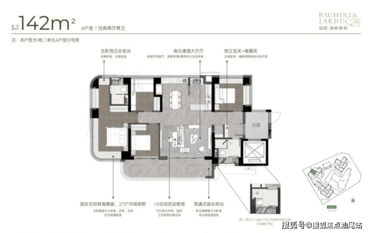 142m²四房两厅两卫的A户型:双龙抱珠户型,得房率约92-100%(含赠送),朝向为西南或东南。