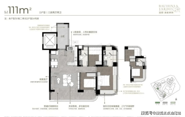 111m²三房两厅两卫的D户型:竖厅格局,得房率约92-100%(含赠送),朝向为西南或东南。