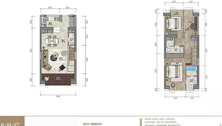 ★88㎡复式两房两厅三卫 双向通透采光,5.4米开间客厅及主卧,双套房周全设计,室内多变空间可根据家庭需要设置独特的功能。