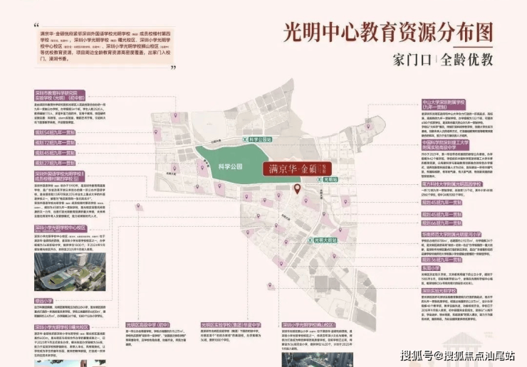 满京华·金硕项目直面占地约208万㎡的科学公园(在建中),近享深圳国际美术馆(暂定名、在建中)、深圳科学技术馆、科学城体育中心(在建中)、会议中心(规划中)等市政级文体配套;还坐拥狮山公园(规划中)、约9.4万㎡的东周文化公园,约10万㎡的开明公园,约56万㎡的新城公园等丰富绿色生态资源。