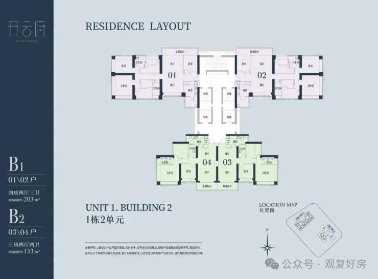 有2个户型,分别是西北,东南朝向;都是是双龙抱珠格局,其中A2(03/06)户型客厅超大观景阳台(近7米);