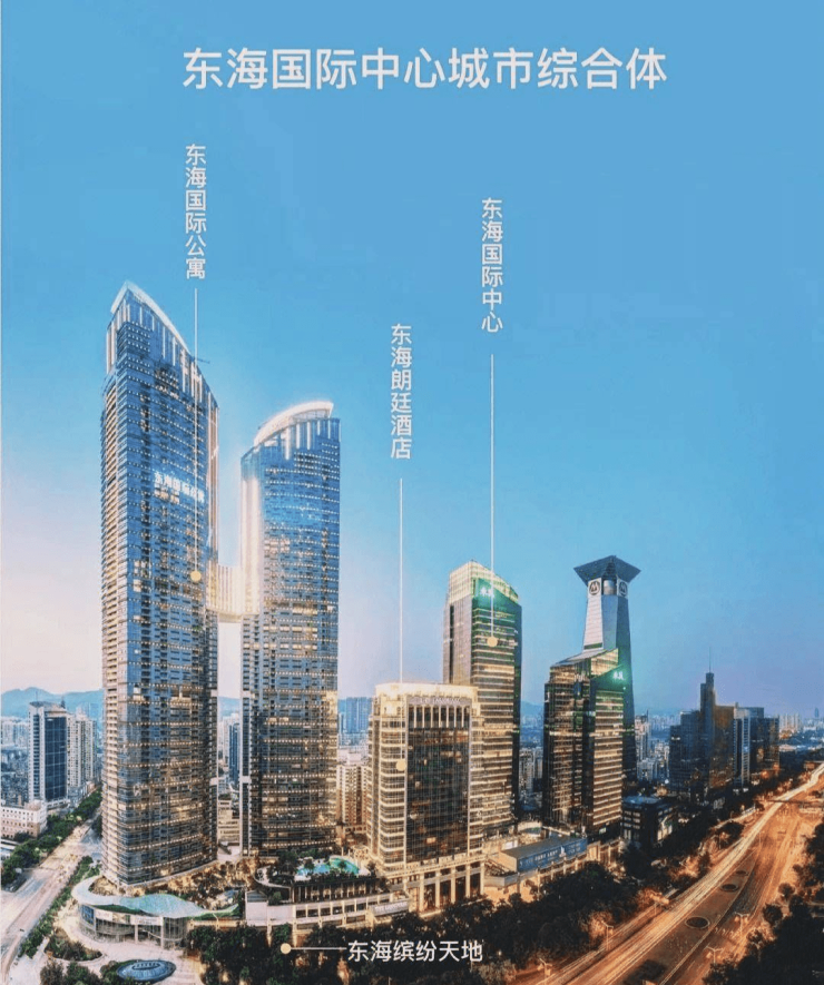 东海国际中心项目由办公楼、酒店、商务公寓、商业四大部分组成;是现今深圳深南大道两旁最大的综合建筑群,其中办公楼2幢,高度约为190米/150米;酒店1座,约为100米;商务公寓2幢,高度约为300米/255米;还有约65365平方米的商业。