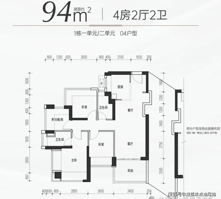 94㎡的4房2厅2卫,设计的是竖厅格局,进门独立玄关,LDKB一体化,S墙设计预留冰箱卡槽位,主卧双飘窗设计,U型厨房,卫生间干湿分离,得房率约97%(包含赠送),东南朝向。
