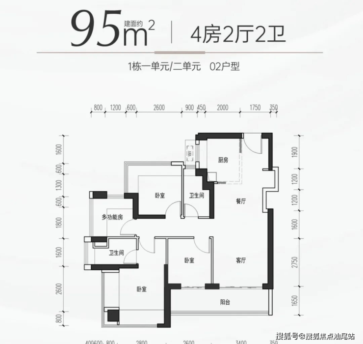 95㎡的4房2厅2卫,设计的是竖厅格局,进门独立玄关,LDKB一体化,S墙设计预留冰箱卡槽位,主卧双飘窗设计,客厅连接次卧出6米长的大阳台,L型厨房,卫生间干湿分离,得房率约97%(包含赠送),西南朝向。