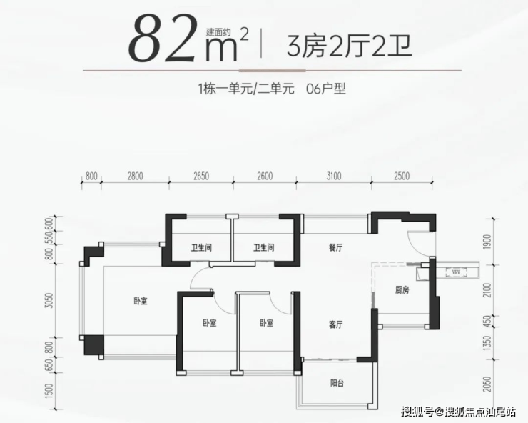 82㎡的3房2厅2卫,06户型,设计的是竖厅南北通透格局,进门独立玄关,LDKB一体化,主卧270°飘窗设计,U型厨房,卫生间干湿分离,得房率约98%(包含赠送),阳台主朝西北向。