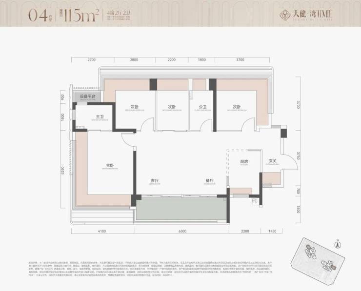 115㎡4房2卫:大横厅户型,朝南看海,使用率很高,但三个次卧朝北