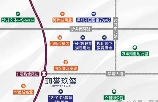 公共交通方面,「珈誉玖玺」位于综合体南侧,临近11号快线塘尾地铁站。