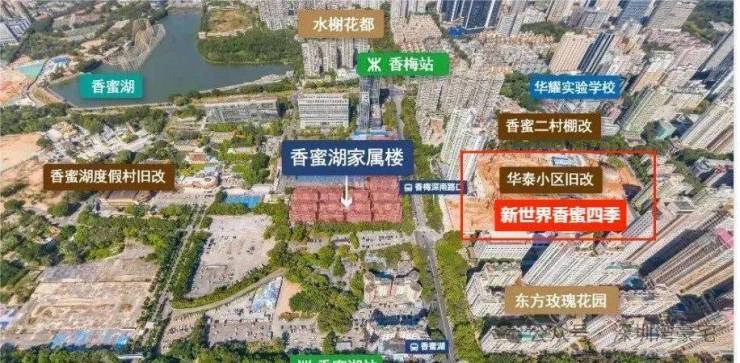 【新世界香蜜四季花园】前身为华泰旧改项目,其早在2010年便被纳入城市更新计划,但直到2021年才启动开工仪式,到今年才出地面多层,有入市消息。因为近香蜜湖新金融中心,项目名称带上香蜜,可以蹭下香蜜片区的豪奢感,其实属于景田片区,也是景田十几年来除了天健天骄外的唯一新盘。