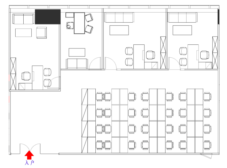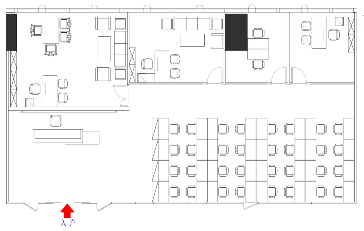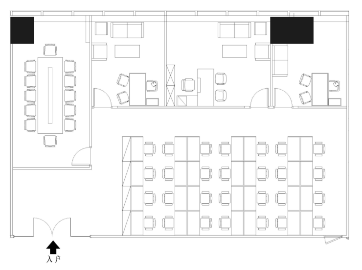 步入前台,户型方正,布局合理,功能区域分布清晰,正南朝向,采用了4+1的格局,办公区能容纳28个卡座,还有老板间,经理室以及会议室。