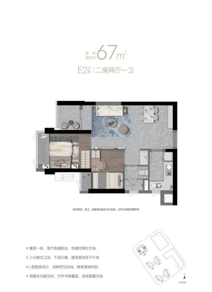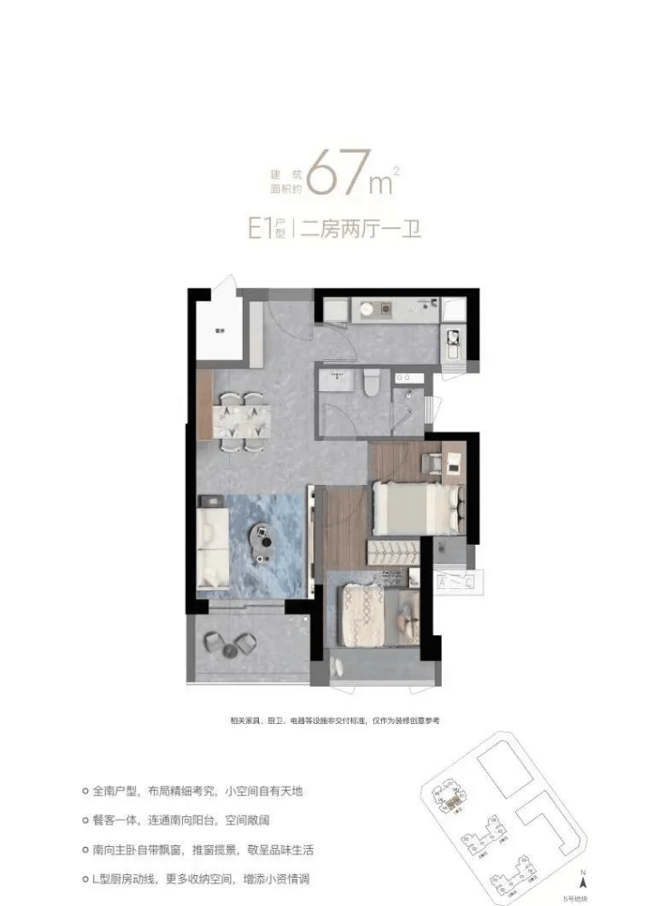 最大亮点:67㎡两居一卫。深圳核心区近年稀缺两居产品,分E1(东南向)和E2(西南/东北向)两种户型,客厅采光和主卧门位置各异。