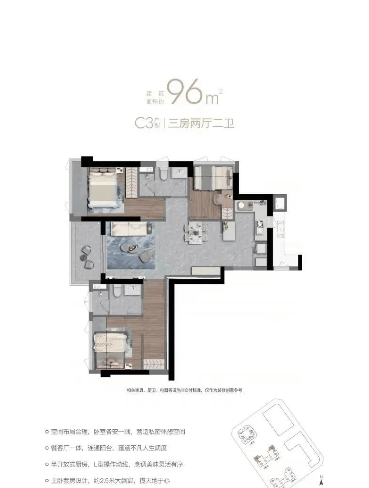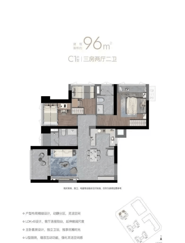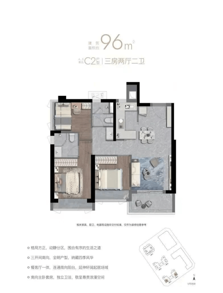 96㎡三室两卫,户型分竖厅和双龙抱珠。C1客厅西南/东北,主卧西北;C2东南;C3西南/东北。