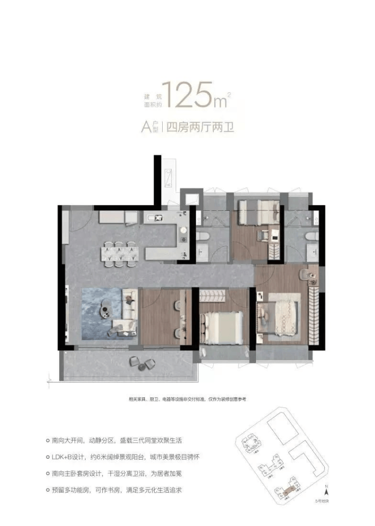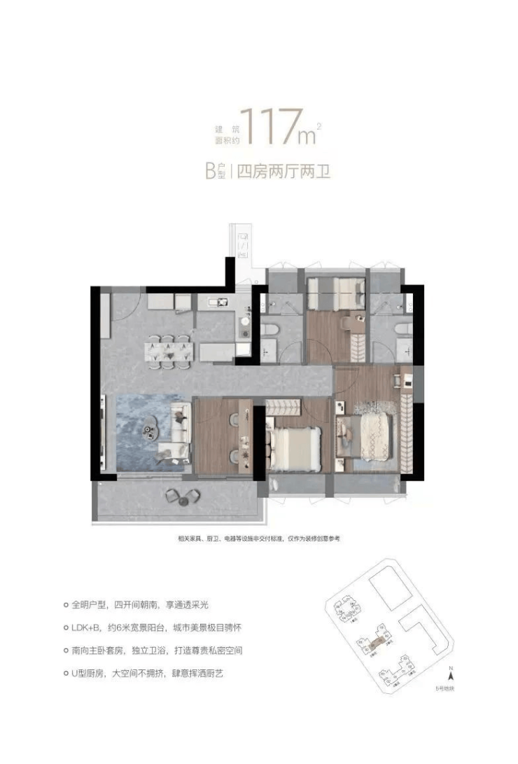 117-125㎡四房二卫,竖厅端头,客厅及三卧东南向。两户型相同,区别在尺度和楼栋位置。